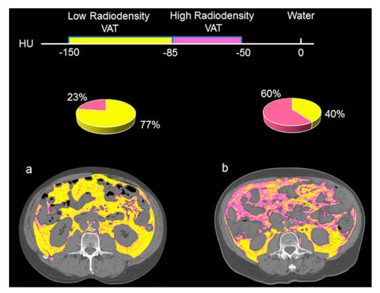 | Visceral Adipose Radiodensity, (HU) | −77 ± 5 | −93 ± 5 | <0.001 |