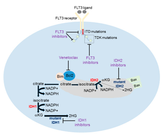 Inhibitors have been designed to target major pathways deregulated in acute myeloid leukemia (Bcl-2), mutant form of metabolic regulatory enzymes (IDH1/2), and proliferation (FLT3). Abbreviations: 2-HG: 2-hydroxyglutarate; α-KG: Alpha-ketoglutarate; BAX: Bcl-2-like protein 4; Bim: Bcl-2-like protein 11; Bcl-2: B-cell lymphoma 2; FLT3: Fms-related tyrosine kinase 3; IDH: Isocitrate dehydrogenase; ITD: Internal tandem duplication; NADP(H): Nicotinamide adenine dinucleotide phosphate; TKD: Tyrosine kinase domain.