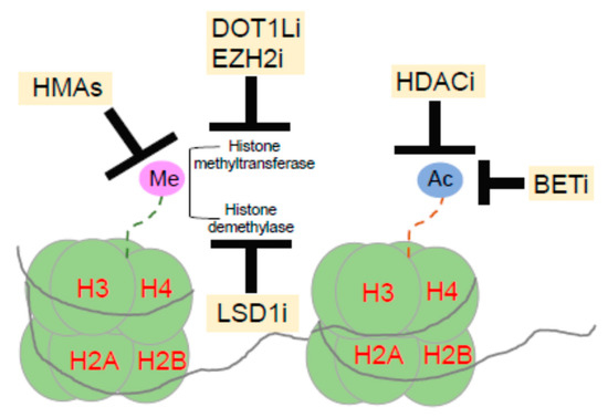 Epigenetic drugs influence main post-translational modifications of the nucleosomal histones including deacetylation of lysine residues (HDACi), methylation (HMAs), reduction of H3K79 methylation (DOT1Li) and H3K27 (EZH2i), demethylation of lysine residues (LSD1i) and bromodomain, and extra-terminal motif inhibitor (BETi). Abbreviations: Me: Methylationl Ac: Acetylation; HDAC: Histone deacetylase; HMA: Hypomethylating agents; DOT1L: Disruptor of telomeric silencing 1-like; EZH2: Enhancer of Zeste 2 Polycomb Repressive Complex 2 Subunit; LSD1: Lysine specific demethylase 1.