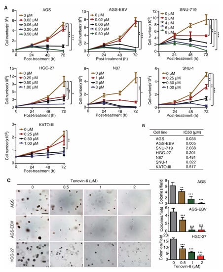 2.1. Tenovin-6 Inhibits Cell Proliferation and Anchorage-Independent Growth of GC Cells