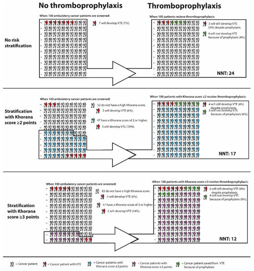 VTE incidence in cancer patients with and without thromboprophylaxis, stratified by Khorana score. Abbreviations: NNT, number needed to treat; VTE, venous thromboembolism. * Calculations based and extrapolated from Mulder et al; The Khorana Score For Prediction Of Venous Thromboembolism In Cancer Patients: A Systematic Review And Meta-Analysis [58], Carrier et al; Apixaban to Prevent Venous Thromboembolism in Patients with Cancer [73], and Li et al, Direct Oral Anticoagulant for the Prevention of Thrombosis in Ambulatory Patients with Cancer: A Systematic Review and Meta-Analysis [22].