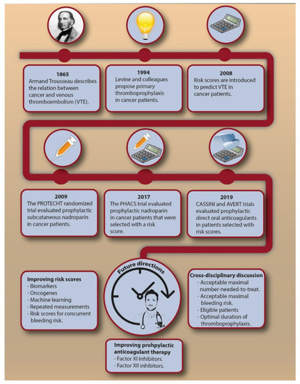 VTE is a frequent and potentially invalidating disease complication in cancer patients. Despite the recent and more remote advances (Figure 2), future steps in VTE prediction are needed to effectively reduce the burden associated with cancer-associated VTE. At present, we believe current evidence does not justify primary thromboprophylaxis in all cancer patients with a Khorana score of 2 or higher, which would have consequences for millions of patients worldwide. Additional randomized trials could strengthen the evidence and, when restricted to specific cancer types, address the uncertainty about the risk-benefit for specific cancer types. Improvements in VTE prediction in cancer patients are needed to lower the NNT to prevent one VTE associated with thromboprophylaxis. Most clinical prediction scores that were proposed as improvement to the Khorana score require further external validation. Several other clinical risk factors or biomarkers could ameliorate VTE prediction, such as serum platelet factor 4, citrullinated histone H3 as a marker for neutrophil extracellular traps, and extracellular vesicles bearing tissue factor, which showed promising results in smaller cohort studies [64,78,79]. Genetic risk factors for VTE have previously shown to be an important predictor for VTE in cancer patients [65], while specific tumor mutations also appeared to be associated with VTE [80,81]. This implies that genomic characterization of tumors could provide relevant information not only for cancer prognosis, but also for the risk of VTE. Repeated measurements of prediction scores should be explored to see whether continuously updated, dynamic risks are clinically helpful [82]. Machine learning could help in identifying new risk factors in large datasets to obtain accurate and precise personalized risk estimates [83]. From a pharmacological perspective, new agents for the treatment of VTE are currently explored, of which factor XI and XII inhibitors appear to be most promising [84,85,86]. If these agents prove to be safe and effective for the treatment of cancer-associated VTE, they could provide a basis for future thromboprophylactic strategies. More effort is needed in predicting the concurrent bleeding risk, which might help to reduce the NNH. Lastly, a cross-disciplinary discussion is needed to obtain consensus on an acceptable NNT and maximally tolerated bleeding risk.