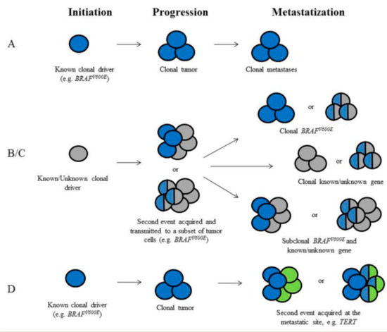 Hypotheses related to papillary thyroid cancer oncogenesis and progression (see text). (A) A known mutation occurs in the thyroid follicular cell and leads to the development of the tumor. (B,C) The tumor is established by a genetic driver (known or unknown). A second genetic event is acquired either in the same cell (B) or in a different cells (C) and transmitted with a sub-clonal distribution at the primary site. (D)A second genetic event is acquired at the metastatic site.