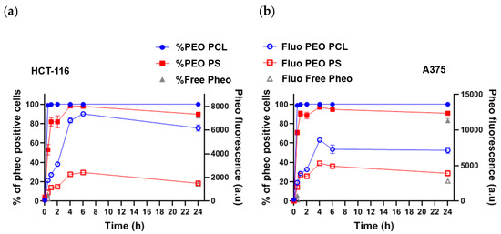 Moreover, the Pheo uptake by human tumor cells was assessed by flow cytometry, which gave an indication of the total quantity of Pheo present in the cells over time (Figure 2). Two distinct cancerous cell types were used in this experiment: Human colorectal HCT-116 and human melanoma A375 cancer cell lines. Pheo penetration within cells seemed to follow the same kinetics, whichever the nanocarrier (i.e., PEO-PCL or PEO-PS micelles), with a maximum of fluorescence reached after 4 to 6 h of incubation. We observed for both cell types that 100% of the cell population were positively labelled by Pheo within the first hours of incubation with encapsulated Pheo. After 24 h of incubation with Pheo loaded micelles or free Pheo, cell fluorescence intensity was comparable between PEO-PS micelles and free Pheo, while much stronger with PEO-PCL micelles. This suggests that more Pheo was found in cells when carried by PEO-PCL micelles than with PEO-PS ones which did not differ from free Pheo. This observation seems to contradict what we observed in experiments on biomimetic membranes, but it must be underlined that acellular experiments were performed in PBS, so no other competitive absorption on hydrophobic environment could take place. This is not true in the case of cell experiments where fetal bovine serum (10%) was employed to feed the cells. We can expect that free Pheo in solution interacted with the cell culture proteins, and thus, decreases the absorption at the cell scale.