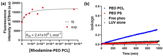 Figure 1a represents the association constant of the photosensitizer Pheo towards the two used block-copolymers, PEO-PCL and PEO-PS, organized into micelles. In a typical experiment, different quantities of the copolymers (concentration between 10−7 and 10−4 M) were added to a Pheo solution at 10−8 M in PBS and the fluorescence intensity was measured at 675 nm. A representative set of fluorescence spectra is reported in Figure S1. When Pheo was in its monomer form, free in aqueous solution, the fluorescence signal was as expectedly low [25] and then progressively increased upon micelle addition, as Pheo progressively entered the hydrophobic environment of the nano-objects. Once Pheo is encapsulated in the nano-objects, it is in monomer form, as witnessed by the absorbance spectrum in the presence of the amphiphilic molecules, which is very similar to those obtained in an organic solvent, such as ethanol and by the fluorescence lifetime values (see Figures S2–S6 and Table S1). According to Kuzelova et al. [26] an equilibrium can be written between Pheo free in solution and the empty copolymers organized in nano-objects and that encapsulated in the nano-objects as follows,