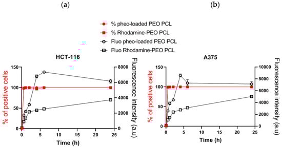 As described in Section 4.9, 80,000 HCT-116 or A375 cells were seeded in 12-well plates the day before the experiment. The cells were incubated for 24 h, 6 h, 4 h, 2 h, 1 h and 30 min with micelles produced with PEO-PCL, covalently-linked to rhodamine, at a ratio of 1/10 with unlabeled PEO-PCL. 4 biological replicates were used in each condition. In this experiment, the final concentration of PEO-PCL polymer was set at 10 µM, as in the previous experiment on photosensitizer penetration quantified by flow cytometry. After the last incubation time, cells were washed with 2 mL of PBS, gently trypsinized and dispatched in a 96-well plate U bottom, kept on a bed of ice. Cells in suspension were then analyzed on a BD LSRFortessa X-20 flow cytometer, equipped with an HTS module for plate reading. At least 20,000 events were acquired in each well. Flow cytometry allows the quantification of Rhodamine-PEO-PCL polymer fluorescence within the cells (either in the plasma membrane or intracellular). Using this method, no speculation can be made on whether PEO-PCL is still self-assembled as micelles or dispersed in unimer form.
