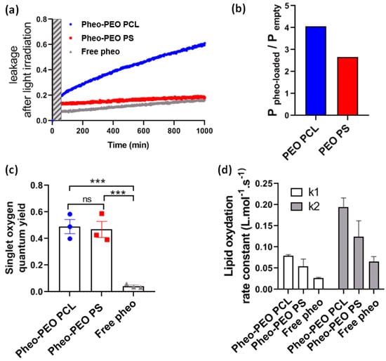 Analysis of Pheo loaded micelles interactions with liposomes under light irradiation. (a) The permeability of liposomes was quantified by fluorescence through carboxyfluoresceine (CBF) leakage. Dashed bar indicates light irradiation. LUV = Large Unilamellar Vesicle. (b) P = permeability constant. (c) Singlet oxygen quantum yield of free Pheo of Pheo loaded micelles quantified by spectrophotometric analysis. (d) Determination of oxidation rate constant from fitted UPLC-MS data. *** = p < 0.001.