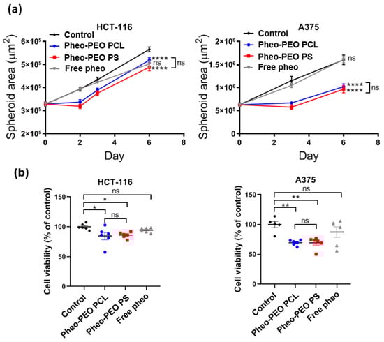 We compared efficiency of Pheo loaded PEO-PCL or PEO-PS micelles in PDT of human 3D tumor spheroids (Figure 7). Both HCT-116 and A375 cell lines led to the production of 3D spheroids (Appendix A Figure A1), even if epithelial HCT-116 cells allowed the formation of rounder spheroids compared to the A375 ones. Their growth was followed over 6 days after a single PDT treatment with 3 µM Pheo loaded micelles or free Pheo (Figure 7a). While free Pheo did not affect the growth curve of spheroids, a growth delay was observed within two days after PDT treatment with Pheo loaded PEO-PCL or PEO-PS micelles. This growth delay was temporary, since spheroids kept growing after this latent phase. No statistical difference was observed between PEO-PCL and PEO-PS micelles. To confirm these optical observations, the intracellular ATP of the spheroids was measured 6 days after PDT treatment in each condition (Figure 7b), since ATP is generally considered a good indicator of cell viability [31]. No statistical difference was observed between the control and free Pheo conditions. Intracellular ATP was significantly lower in spheroids treated with Pheo loaded PEO-PCL and PEO-PS, even if no difference was observed between these two kinds of micelles.