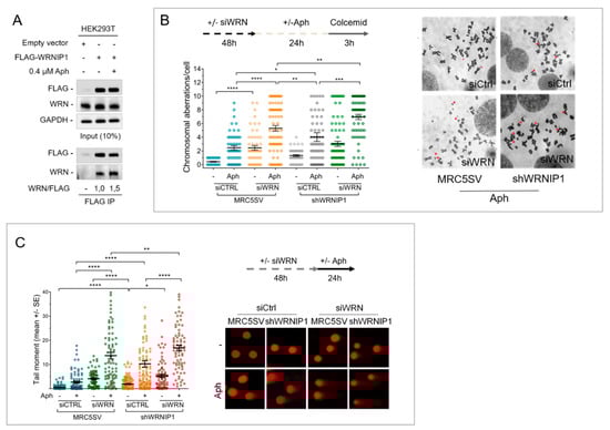 Loss of Werner Syndrome Protein (WRN) and WRNIP1 exacerbates genomic instability upon mild replication stress (MRS). (A) Co-IP analysis showing the interaction between WRN and WRNIP1 after IP with anti-FLAG antibody in HEK293T cell extracts, followed by Western blot with the indicated antibodies; (B) Analysis of chromosomal aberrations. Data are presented as chromosomal aberration per cell. Error bars represent standard error; (C) Alkaline comet assay in cells treated as in (B). Data are presented as tail moment ± SE from three independent experiments.