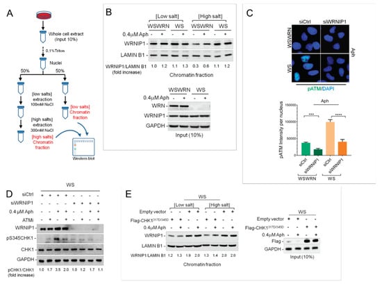 WRNIP1 mediates the ATM-dependent CHK1 phosphorylation in WS cells. (A) Schematic representation of chromatin fractionation assay; (B) The membrane was probed with the indicated antibodies. The amount the chromatin-bound WRNIP1 is reported as a ratio of WRNIP1/LAMIN B1 normalized over the untreated control; (C) IF analysis of cells transfected with Green Fluorecent Protein (GFP) or WRNIP1 siRNA and stained for pATM (S1981). Bar graph shows pATM intensity per nucleus. Error bars represent standard error; (D) WB analysis of the presence of activated, i.e., phosphorylated, CHK1 assessed using S345 phospho-specific antibody (pS345) in WS cells depleted for WRNIP1 and treated with Aph. ATMi was added 1 h prior to Aph and used as a negative control. The membrane was probed with the indicated antibodies. The normalized ratio of the phosphorylated CHK1/total CHK1 is given. (E) WB analysis of chromatin binding of WRNIP1, performed as in (A) in WS cells transfected with empty vector or FLAG-tagged CHK1317/345D and treated with Aph. The membrane was probed with the indicated antibodies. The normalized ratio of the WRNIP1/LAMIN B1 signal (chromatin) is reported.