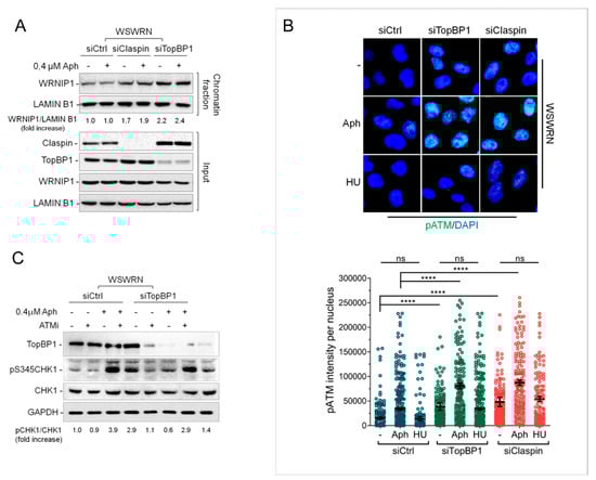 Increased stability of WRNIP1 in chromatin is linked to defective CHK1 activation observed in the absence of WRN early after MRS. Several factors facilitate the early ATR-mediated CHK1 phosphorylation, including the ATR kinase-activating protein DNA Topoisomerase 2-binding protein 1 (TopBP1) [] and the CHK1-interacting factor Claspin [,]. Hence, we asked whether increased binding of WRNIP1 to chromatin is a general response to compromised phosphorylation of CHK1. To this aim, we used siRNAs to deplete endogenous TopBP1 or Claspin expression in wild-type cells (WSWRN) and examined WRNIP1 retention in chromatin at high salt concentration upon MRS. The total amount of WRNIP1 was comparable in mock-depleted, TopBP1-, or Claspin-depleted cells under unperturbed conditions or after treatment (Figure 3A). Interestingly, however, TopBP1 or Claspin depletion greatly enhanced WRNIP1 binding to chromatin under high salt concentration, irrespective of the Aph treatment (Supplementary Figure S5 and Figure 3A).