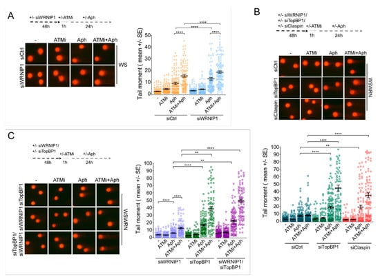 Similarly, the downregulation of TopBP1 or Claspin in WSWRN cells resulted in DNA damage potentiation upon MRS (Figure 4B). Notably, more than an additive effect was detected after a combination of ATM inhibition and TopBP1 or Claspin depletion in Aph-treated wild-type cells (Figure 4B).
