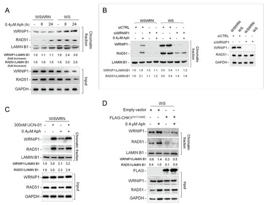 Overall, our observations suggest that WRNIP1 may play a role in stabilizing RAD51 after MRS in WRN-deficient cells because of the impaired early CHK1 activation.