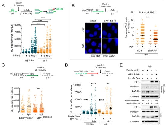 RAD51-ssDNA association requires WRNIP1 in WS cells upon MRS. (A) Detection of ssDNA by IF with an anti-BrdU/IdU antibody in WSWRN and WS cells treated with 0.4 µM Aph for different times as reported in the scheme. Graph shows the mean ± SE from three independent experiments; (B) Analysis of proximity between ssDNA (anti-BrdU/IdU antibody) and endogenous RAD51 (anti-RAD51 antibody) performed by in situ PLA assay in WS cells depleted of WRNIP1 and treated as reported in the scheme. PLA interaction is shown in red. Graph shows the number of PLA spots per nucleus; (C) Detection of ssDNA by IF with anti-BrdU/IdU antibody in WS cells transfected with an empty vector or a FLAG-tagged CHK1317/345D and treated with 0.4 µM Aph. Graph shows the mean ± SE from three independent experiments; (D) Detection of ssDNA by IF with anti-BrdU/IdU antibody in WSWRN or WS cells treated as reported in the scheme after transfection with a plasmid expressing GFP-tagged RNaseH1. Graph shows the mean ± SE from three independent experiments; (E) WB analysis of chromatin binding of WRNIP1 and RAD51 in WS cells treated as in (D). Chromatin fractionation was performed as described in Figure 2A. The membrane was probed with the indicated antibodies. The normalized ratio of the chromatin-bound WRNIP1/LAMIN B1 or RAD51/LAMIN B1 are given.