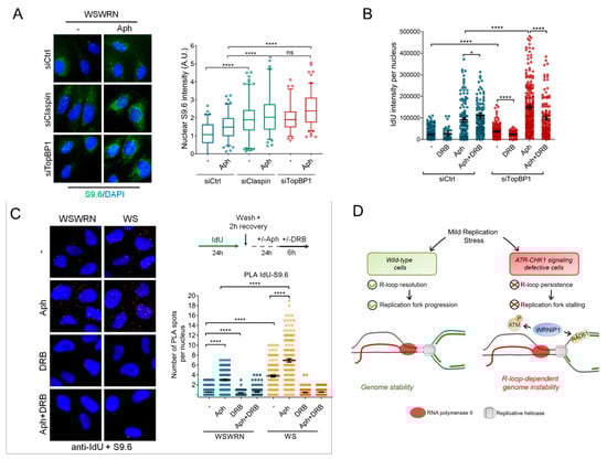 Spatial proximity between ssDNA and R-loops upon MRS in cells with dysfunctional ATR-dependent checkpoint. (A) Immunofluorescence detection of R-loops with S9.6 antibody in WSWRN cells transfected with GFP, Claspin, or TopBP1 siRNA and treated with 0.4 µM Aph for 24 h. Box plot shows nuclear S9.6 fluorescence intensity. Box and whiskers represent 20–75 and 10–90 percentiles, respectively; (B) detection of ssDNA by IF with an anti-BrdU/IdU antibody in WSWRN transfected with GFP or TopBP1 siRNA and treated with 0.4 µM Aph for 24 h. Graph shows the mean ± SE from three independent experiments; (C) analysis of proximity between ssDNA (anti-BrdU/IdU antibody) and R-loops (anti-S9.6 antibody) performed by in situ PLA assay in WSWRN cells transfected with GFP or TopBP1 siRNA and treated as reported in the scheme. PLA interaction is shown in red. Graph shows the number of PLA spots per nucleus; and (D) proposed model of a role of WRNIP1 in suppressing R-loop-induced genome instability in cells with dysfunctional ATR-mediated checkpoint.