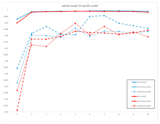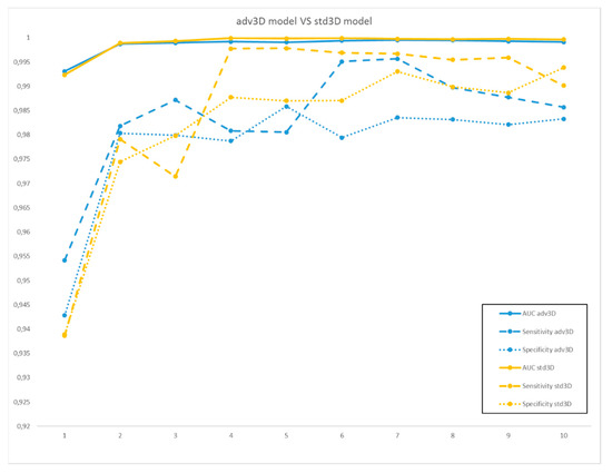 By inspecting the curves in Figure 1 and Figure 2, very similar and good results were obtained by the three classification models. In more detail, from the comparison between the adv3D and adv2D comparable results in terms of AUC, the sensitivity was higher for adv3D, except for model order 5; this was in contrast with specificity, which was higher on average for adv2D. On the other hand, the comparison between adv3D and std3D highlighted higher results for std3D, except for low order models.