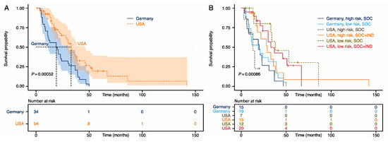Kaplan–Meier estimates for stage IV colorectal cancer patients according to country and treatment regimens. (A) Patients in America diagnosed in 2008–2017 had a median survival probability of 33 months, compared to 19.5 months in patients in Germany diagnosed in 2003–2010. Shading indicates 95% confidence intervals. (B) Kaplan–Meier curves stratified by country, standard of care (SOC), and SOC, followed by individualized treatments (SOC + IND), and mutational high risk (Schell classes 0 and 4) vs. low risk (Schell classes 1–3). NB: The American SOC between 2008 and 2017 was more individualized than the German SOC between 2003 and 2010.