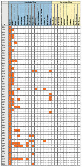 Treatments received by the German patients (G01–G54) in 2003–2010. The asterisk (*) marks patients who received chemotherapy at external oncological practices.