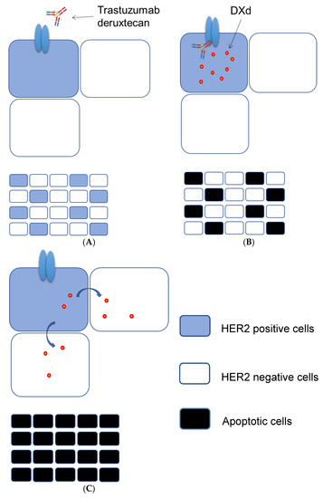 Proposed mechanism for the “bystander killing effect” of trastuzumab deruxtecan. The binding of trastuzumab deruxtecan to HER2 expressed on the surface of HER2-positive tumor cells (A) triggers its internalization followed by the release of DXd into the cytoplasm and the induction of apoptosis (B). (C) DXd is then transferred to and induces apoptosis in neighboring HER2-negative cells.