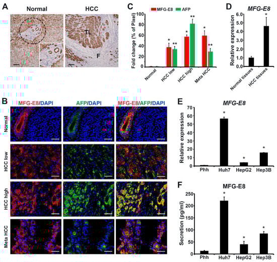 Expression of milk fat globule-EGF factor 8 (MFG-E8)in clinical hepatocellular carcinoma (HCC) tissues and HCC cell lines. (A) Immunohistochemical staining of MFG-E8 in HCC tissues and normal liver tissues obtained from patients with HCC. Inset, enlarged image of the dashed circular area. TL, tumor lobule; F, fibrous septa. Scale bars, 100 μm. (B) Representative immunofluorescence images of primary and metastatic HCC tissues, showing the expression of MFG-E8 and AFP. Cell nuclei were stained with DAPI. Scale bars, 50 μm. Quantitation of immunoreactive cells are shown in (C). The percentages of positive immunofluorescence signal intensities of total image (% of pixel) were measured using ImageJ software and expressed as relative values to those in normal tissues. (D,E) The mRNA expression levels of MFG-E8 in normal tissues and HCC tissues (D) and in human primary hepatocytes (Phh) and HCC cell lines (Huh7, HepG2, and Hep3B) (E). mRNA expression data were normalized to GAPDH levels and expressed as relative values. (F) The levels of MFG-E8 protein secreted from human Phh and HCC cells. Data represent the mean ± S.D. * p < 0.05 versus normal tissue (C,D) and Phh (E,F) by a two-tailed Student’s t-test.