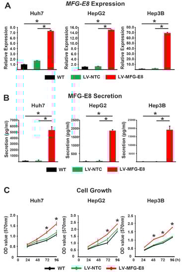 Effects of MFG-E8 overexpression on HCC cells proliferation. (A,B) The levels of mRNA (A) and secreted protein (B) of MFG-E8 from HCC cells after transfection with nontargeting control lentivirus (LV-NTC) or MFG-E8-overexpressing lentivirus (LV-MFG-E8). WT, untransfected cells. (C) Growth curves of HCC cells after transfection with LV-NTC or LV-MFG-E8. * p < 0.05, a two-tailed Student’s t-test.