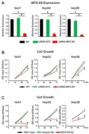 Effects of MFG-E8 knockdown and activity inhibition on HCC cell proliferation. (A) The mRNA expression levels of MFG-E8 in HCC cells after transfection with nontargeting control siRNA lentivirus (siRNA-NTC) or MFG-E8-siRNA lentivirus (siRNA-MFG-E8). (B) The proliferation of HCC cells was evaluated at different time points in cells transfected with siRNA-NTC or siRNA-MFG-E8. (C) Growth curves of HCC cells cultured in the absence (untreated) and presence of isotype control IgG or anti-MFG-E8 antibody (MFG-E8 Ab). * p < 0.05 versus WT, a two-tailed Student’s t-test.