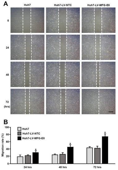 Effects of MFG-E8 overexpression on HCC cells migration. (A) Migration of Huh7 cells transfected with either nontargeting control lentivirus vector (LV-NTC) or LV-MFG-E8 was evaluated by a scratch assay; phase-contrast images were taken 24, 48, 72, and 96 h after making the mechanical scratch wound in vitro. The migration rates are shown in (B). Data represent the mean ± S.D. * p < 0.05, a two-tailed Student’s t-test. Scale bars, 200 μm.