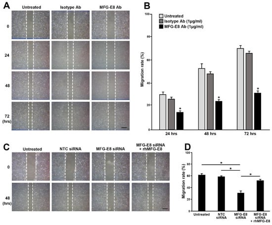 In contrast, the motility of Huh7 cells was steadily and markedly impaired by treatment with anti-MFG-E8 antibodies (1 μg/mL) during the 72 h of measurement (Figure 5A,B; data obtained from HepG2 and Hep3B are provided in Figures S2 and S3). Silencing of MFG-E8 expression using siRNA (siRNA-MFG-E8) also significantly decreased the migratory capability of Huh7 cells compared with both control siRNA-NTC and WT cells 48 h after transfection (Figure 5C,D; data obtained from HepG2 and Hep3B are provided in Figure S4). However, the reduction in motility of MFG-E8 siRNA-transfected HCC cells was rescued by the addition of recombinant human MFG-E8 protein (rhMFG-E8, 500 ng/mL) (Figure 5C,D).
