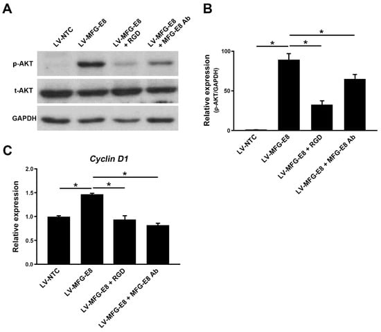 MFG-E8 regulates Akt phosphorylation and Cyclin D1 expression. (A) Representative western blots for the phosphorylation of Akt in control (LV-NTC) and MFG-E8 overexpressing (LV-MFG-E8) HCC cells (Huh 7). LV-MFG-E8-HCC cells were cultured in presence or absence of MFG-E8 antibodies (MFG-E8 Ab, 1 μg/mL) or GRGDSP peptide (RGD, 100 μM) for 24 h. (B) Quantitation of the Akt phosphorylation in HCC cells cultured under different conditions. (C) The RNA expression levels of cyclin D1 (CCND1) in HCC cells. Cells were cultured and treated as in (A). * p < 0.05, a two-tailed Student’s t-test.