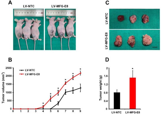 MFG-E8 overexpression promotes growth of HCC xenografts in vivo. (A) In vivo visualization of solid tumors in xenograft mice that received Huh7 cells transfected with LV-NTC or LV-MFG-E8. Images were taken 9 weeks after grafting. (B) Tumor volume was measured using a slide caliper every week for 9 weeks (n = 3 per group). (C) Dissected xenografts generated from Huh7 cells transduced either with LV-NTC or LV-MFG-E8. Scale bars, 10 mm. (D) Quantitative analysis of tumor weights 9 weeks after grafting.