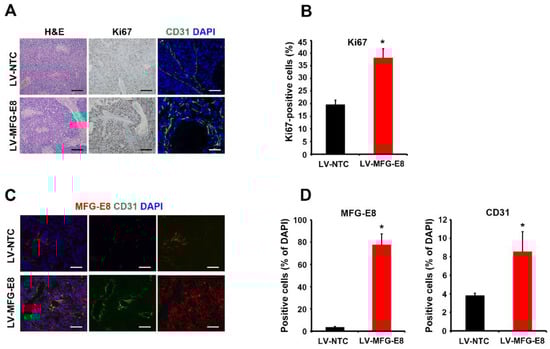 The data obtained from clinical samples and in vitro assays prompted us to investigate whether MFG-E8 promotes tumor formation in a mouse xenograft model. BALB/c nude mice were injected with Huh7 cells transduced with either control lentivirus (LV-NTC) or MFG-E8-overexpressing lentivirus (LV-MFG-E8) into the right flank (n = 3 for each group). Tumor size was measured up to 9 weeks after grafting (Figure 7A,B). As expected, MFG-E8 overexpression resulted in a marked increase in both tumor volume and weight, compared to the control group (Figure 7B–D). Histological analyses of HCC xenografts revealed that the number of Ki-67-positive proliferating cells was significantly greater in MFG-E8-overexpressing HCC xenografts compared with control HCC xenografts (Figure 8A,B). We also observed that cells positive for CD31, a blood endothelial cell marker, were significantly increased in HCC xenografts overexpressing MFG-E8 over control HCC xenografts (Figure 8C,D). The growth of tumor in xenograft animals was also analyzed after injections of two additional HCC cell lines, Hep3B and HepG2, that overexpressed MFG-E8. A similar pattern of increased tumor growth by the MFG-E8 overexpression was observed in the additional xenograft studies (Data obtained from Hep3B and HepG2 are provided in Figure S5).