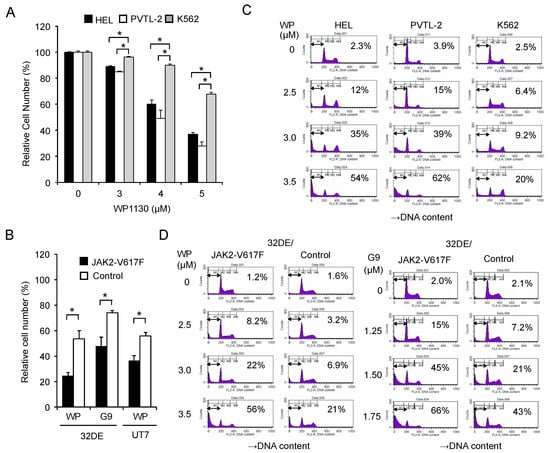 First, we examined the anti-proliferative effect of WP1130 against JAK2-V617F-driven leukemic cell lines. WP1130 inhibited proliferation of HEL and PVTL-2 post-MPN sAML cell lines harboring endogenous JAK2-V617F in dose-dependent manners (Figure 1A). The antiproliferative effects against these cell lines were more prominent than those against BCR-ABL-driven K562, a leukemic cell line derived from patients with CML in blastic phase reported to be susceptible to WP1130 [17,18].