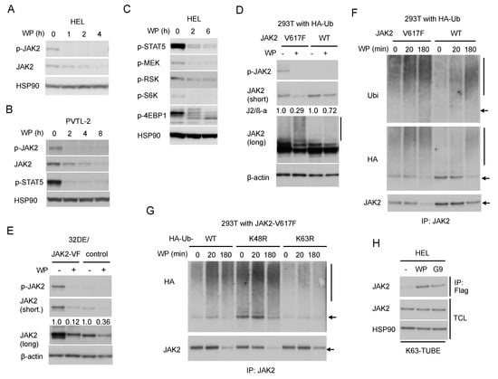 WP1130 enhances K63-linked polyubiquitination and preferentially downregulates the phosphorylated form of JAK2-V617F to inhibit downstream signaling. (A,B,C) HEL (A,C) or PVTL-2 (B) were treated with 5 µM WP1130 (WP) for indicated times. Cells were lysed and subjected to immunoblot analysis with antibodies against indicated proteins. HSP90 was used for a loading control. (D) 293T cells transfected with plasmids coding for either JAK2-V617F (V617F) or wild-type JAK2 (WT) and HA-tagged ubiquitin were treated for 3 h with or without 5 µM WP1130, as indicated, and analyzed. β-actin was used for a loading control. Short and long exposure results are shown where indicated. Relative expression levels of JAK2 as compared with those in untreated cells analyzed by densitometry and normalized by that of ß-actin (J2/β -a) are indicated. The vertical line indicates the smeary pattern characteristic of polyubiquitination. (E) 32DE/JAK2-V617F cells or vector control cells cultured with Epo were treated with or without 5 µM WP1130 for 2 h, as indicated, and analyzed. (F) 293T cells transduced with HA-tagged ubiquitin along with either JAK2-V617F or wild-type JAK2 were treated for indicated times with 5 µM WP1130 and lysed. Immunoprecipitates (IP) obtained with anti-JAK2 were analyzed. The arrow indicates the position corresponding to JAK2. (G) 293T cells transduced with JAK2-V617F along with HA-tagged ubiquitin (WT) or its K48R or K63R mutant were treated with 5 µM WP1130 for indicated times and analyzed. (H) HEL cells were left untreated as control or treated for 30 min with 5 µM WP1130 or 3 µM G9 as indicated. K63-polyubiquitinated proteins were isolated by immunoprecipitation with anti-Flag after incubation of cell lysates with FLAG-K63-TUBE (K63-TUBE). Immunoprecipitates, as well as total cell lysates (TCL), were analyzed.