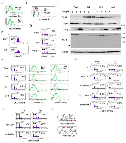 2.4. WP1130 Induces Apoptosis through Activation of the Intrinsic Mitochondria-Mediated Pathway Synergistically with BH3 Mimetics
