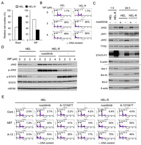 Ruxolitinib-persistent HEL-R cells exhibit an increased sensitivity to WP1130 or BH3 mimetics as compared with control HEL cells. (A) HEL or ruxolitinib-persistent HEL-R cells were left untreated as control or treated with 1 μM ruxolitinib for 48 h or with 2 μM WP1130 for 24 h. Viable cell numbers were measured by the CCK-8 colorimetric assay. Each column represents the mean of triplicate cultures, with error bars indicating standard errors, and is expressed as a ratio to the control. (B) HEL or HEL-R cells were treated with indicated concentrations of WP1130 for 24 h. Cells were analyzed for DNA content by flow cytometry. Percentages of apoptotic cells with the sub-G1 DNA content are indicated. (C) HEL or HEL-R cells were washed and cultured with or without 1 µM ruxolitinib for indicated times and lysed for immunoblot analysis with antibodies against indicated proteins. The results obtained from duplicate gels are shown above or below a horizontal line. ß-actin was used for a loading control. (D) HEL or HEL-R cells were treated for 3 h with indicated concentrations of WP1130 with or without 1 μM ruxolitinib, as indicated, and analyzed. HSP90 was used for a loading control. (E) HEL or HEL-R cells were left untreated as control or treated for 40 h with 1 μM ABT-737 (ABT), 5 nM A-1331852 (A-13), 1 μM ruxolitinib, or 5 μM A-1210477, as indicated, and analyzed.