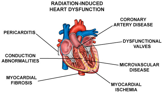 Normal tissue toxicities, mainly in the heart and lungs, can occur after RT in patients with thoracic tumors. The most common toxicities include acute pneumonitis and chronic fibrosis due to radiation exposure of the lung [3,4], and cardiac dysfunction, including pericarditis, ischemic heart disease, conduction abnormalities, myocardial fibrosis, and valvular abnormalities collectively called radiation-induced heart dysfunction (RIHD) (Figure 1) from incidental radiation to the heart and surrounding vasculature [5,6,7,8,9,10]. These side effects may present clinically months to years after RT, affecting patient quality of life and at times even leading to increased mortality [6,9,10,11,12,13,14,15,16]. For example, patients who received tangential RT for left-sided breast cancer in the 1970s and 1980s had an increased risk for cardiovascular mortality at 15 years post-treatment [17]. In patients that received mediastinal radiation for Hodgkin’s disease in the 1960s–1990s, there was a higher prevalence of cardiac abnormalities when compared to the Framingham population [18]. In addition, non-small cell lung cancer (NSCLC) patients may experience RIHD within two years of radiation exposure [14,19,20,21,22]. Numerous other groups have highlighted similar increases in cardiac toxicity-related morbidity and mortality among patients that have received thoracic radiation [23,24,25,26,27].