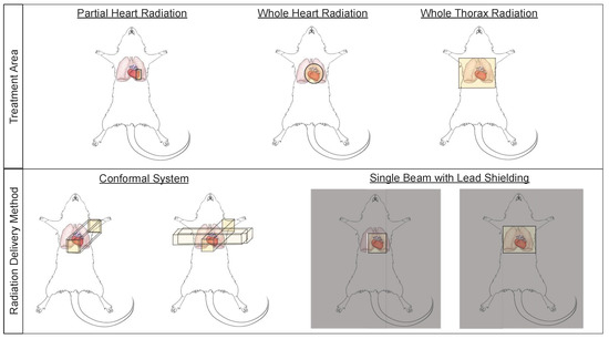 Small animal models have been used to study cardiac radiation toxicity for many decades [39,40,41] based on the physiological similarities of these models to humans [42]. In these models, many current treatment paradigms exist to study RIHD, including whole thorax, whole heart, and partial heart irradiation (Figure 2). Whole thorax irradiation is a method used extensively in the past [43,44,45,46], as it does not require precise image guidance during radiation delivery. Unfortunately, when irradiating the whole thorax, damage occurs not only to the heart, but also the lungs, a dose limiting organ, thereby increasing morbidity and mortality and making it difficult to distinguish whether the resulting damage is from heart or lung irradiation alone, or due to irradiation of both the heart and lungs [45,47] (see also Section 2.3). Modern thoracic RT techniques aim to shield the heart and other organs at risk. However, more advanced techniques and modalities such as intensity-modulated radiation therapy (IMRT) and proton therapy have not been extensively explored in detail in pre-clinical normal tissue toxicity models, although modern small animal irradiators can allow for arc therapy and this technique is beginning to be utilized in pre-clinical models [48].