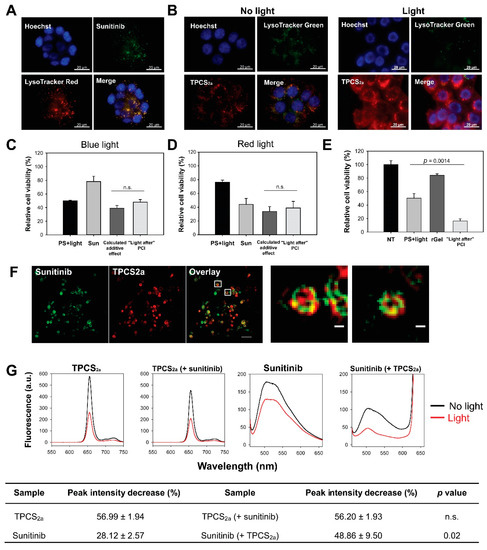 Close proximity of photosensitizer and sunitinib in endo/lysosomal membranes results in photochemical damage of sunitinib and lack of enhanced cytotoxicity with “light after” sunitinib-photochemical internalization (PCI). Representative fluorescence microscopy images of (a) intracellular co-localization (yellow) of sunitinib (green) and LysoTracker Red (red) after 24 h 2 µM sunitinib incubation in live HT-29 cells and (b) LysoTracker Green (green) and TPCS2a (red) co-localization (yellow) after 18 h 0.4 µg/mL TPCS2a incubation and 4 h wash (left) followed by 60 s blue light exposure (right). Blue: Hoechst 33342 stained nucleus. Scale bars: 20 µm. Cellular viability (MTT) of HT-29 cells (c) post-PCI “light after” procedure of 1 µM sunitinib (48 + 18 h incubation) with blue light at LD50 (~60 s) or (d) post-PCI “light after” procedure of 8 µM sunitinib (48 + 18 h incubation) with 90 s red light (mean of three experiments ± S.E.) or (e) 0.5 µM rGel using 60 s blue light (representative experiment of three, mean of triplicates ± S.D.). 60 s blue light ≈ 0.58 J/cm2, 90 s red light ≈ 0.54 J/cm2. (f) Superresolution (structured illumination microscopy, SIM) images of 2 µM sunitinib (green) and 0.4 µg/mL TPCS2a (red) in live HT-29/SR cells after 18 h TPCS2a incubation and 4 h chase. Co-localization indicated in yellow. Images are presented with maximum intensity projection of seven z-sections. One single z-section is presented for the enlarged images. Scale bars: 2 µm and 200 nm (enlarged) (g) Representative fluorescence emission spectra of 0.15 µg/mL TPCS2a, 1.5 µM sunitinib, and the combination in phosphate-buffered saline (PBS) with 1% fetal bovine serum (FBS) before and after blue light exposure (≈18.9 J/cm2) at pH 7. Data in the table are presented as decrease in peak intensity (%) after light exposure (mean of three experiments ± S.E.). n.s.: not significant. Statistical significance calculated with Student’s test (two-tailed p value).