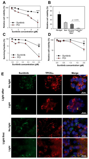 As sunitinib was found subjected to photochemical damage by TPCS2a and light, it was expected that sunitinib-PCI with “light after” would not induce synergistic effects on cell viability. Indeed, no difference in light-induced toxicity was found between TPCS2a-treated HT-29/SR and HT-29 cells (Figure 3f), and PCI with “light after” procedure yielded no statistically significant difference between sunitinib alone and PCI “light after” at 8 µM sunitinib (Figure 3g).