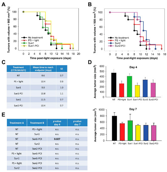 Sunitinib-PCI treatment response of CT26.WT allografts in BALB/c mice. Kaplan-Meier plots illustrating treatment responses following (a) Sun1- and (b) Sun2-PCI, where asterisk indicates significance compared to no treatment. (c) Mean estimated time to reach endpoint in each treatment group. (d) Average tumor size in the indicated treatment groups at day 4 (upper panel) and day 7 (lower panel) post-light exposure. (e) Table of p values is shown in cases where the difference in tumor size between the treatment groups is significant (p ≤ 0.05) at day 4 and day 7. Significant difference established by one-way ANOVA test followed by pairwise multiple comparison procedure (Holm-Sidak). NT: No treatment, n.s.: not significant.
