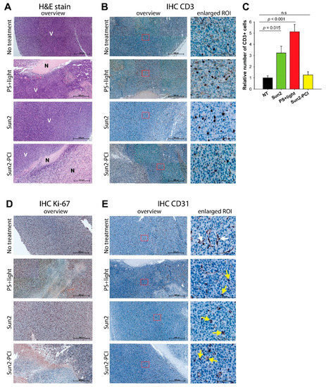 IHC of CT26. WT tumor tissue sections from BALB/c mice treated with the Sun-2-PCI procedure. Representative images of CT26.WT tumor sections, following PS + light, Sun2 or Sun2-PCI treatment. (a) H&E stain (N: necrotic V: viable) and (b) CD3 stain. (c) Quantification of CD3 staining based on three ROIs in each tumor (two tumors in each group). Mean ± S.E. Significant difference established by one-way ANOVA test followed by pair wise multiple comparison procedure. (d) Ki-67 stain and (e) CD31 stain. Arrows indicate intact (white) and collapsed (yellow) vessels. Magnification in overview 20×, scale bar: 500 µm. ROI: region of interest.