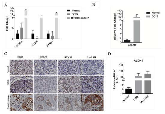 Expression of mRNA and protein of FZD2, SFDP2, STK31, and LALAB in canine normal, DCIS, and invasive cancer. (A) mRNA expression of FZD2, SFDP2, and STK31 in canine normal, DCIS, and invasive cancer tissues. (B) mRNA expression of LALAB. (C) Protein expression of FZD2, SFDP2, STK31, and LALAB in canine normal, DCIS, and invasive cancer. (D) mRNA expression of ALDH1.