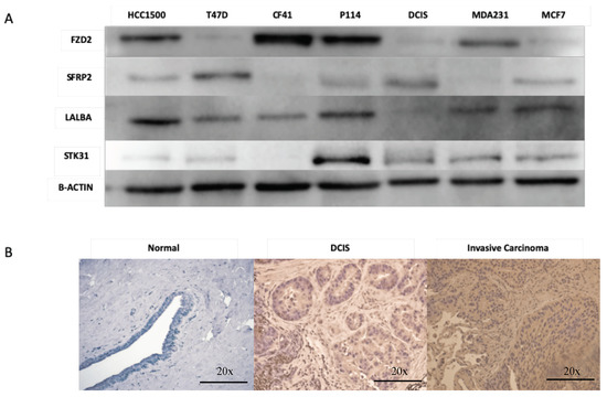 (A) Expression of FZD2, SFRp2, LALAB, and STK31 proteins in malignant human cell lines (HCC1500, T47D, MDA231, and MCF7), human carcinoma in situ cell line (DCIS.com), and canine cell line (CF41 and P114). (B) Expression of LALAB protein in women normal, DCIs, and invasive cancer tissues.