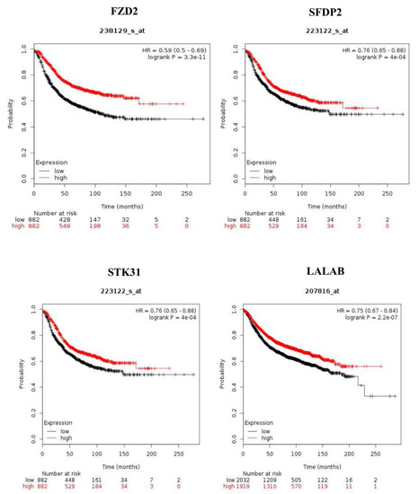 To determine the significance of FDZ2, SFRP2, STK31, and LALBA genes that we identified in canine DCIS progression in women with breast cancer survival, we performed Kaplan–Meier survival analysis using TCGA data and the publically available Kaplan–Meier plotter. The cut-off for the analysis was set at the auto select best cut-off. It is 172, 8383, and 9 for FZD2, SFRP2, and STK31, respectively.