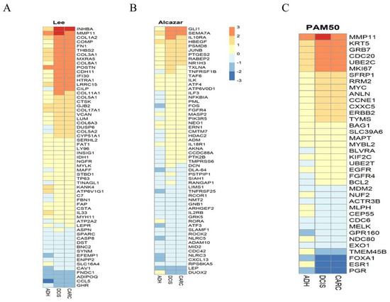 (A) Hierarchical clustering of 72 genes shared between canine and women ADH, DCIS, and invasive cancer. (B) Heatmap of essential human immune genes in canine normal, DCIS and carcinoma samples. (C) Heatmap of PAM50 gene set identified in canine samples.