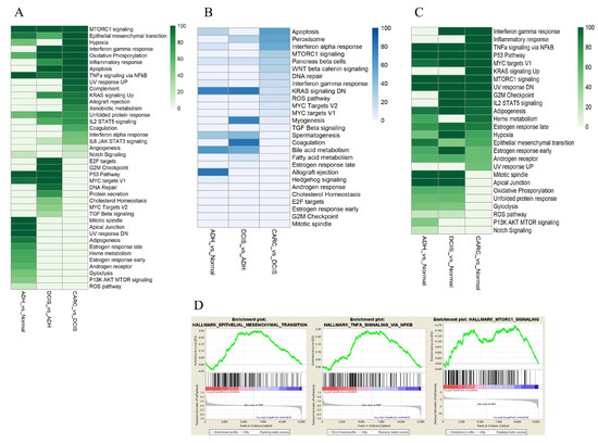 Analysis of the functional gene set enrichment in ADH, DCIS, and invasive cancer. (A) Gene set identified with a positive normalized enrichment score (NES) at p-value < 0.05 and False Discovery Rate (FDR) < 0.05. (B) Pathways identified with a negative NES at p-value < 0.05, and FDR < 0.05. (C) Gene set enrichment for epithelial–mesenchymal transition, NF-KB, and MTORC1. The differential gene expression ranked by fold change. The most up-regulated genes are shown on the left while the most down-regulated genes are shown on the right. The black vertical lines indicate where the genes in the signature get set appeared. (D) Pathways overexpressed along the continuum in ADH, DCIS, and cancer compared to normal.