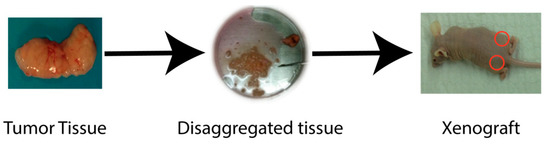 Establishment of xenografts.Tumor tissue obtained from a patient or from an animal model can be used to establish xenografts. Tissue is disaggregated under sterile conditions and implanted into the desired location of recipient mice.