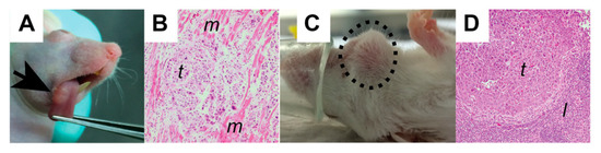 Orthotopic head and neck cancer models. (A) Orthotopic growth of a PDX within the tongue (arrow) can be seen with careful inspection. (B) On histologic evaluation the tumor (t) can be seen infiltrating into tongue muscle (m). (C) Lymph node metastases (dashed circle) can be seen following orthotopic tumor injection, but are less commonly seen with flank models. (D) Histologic evaluation demonstrates the tumor (t) within a lymph node (l).