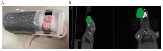 Radiation delivery to head and neck cancer (HNC) xenograft models. (A) Flank models, can be easily irradiated using cabinet irradiators and lead jigs. (B) Using an image-guided small animal irradiator, the tumor (contoured in green) can be targeted with multiple radiation beams to limit dose to other normal structures.