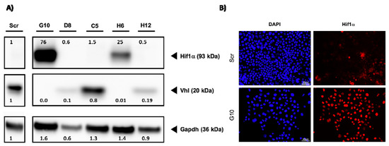 Based on these results, the functional expression of Vhl should be lost in these clones. To validate this on protein level, Western blot experiments were performed. Since the loss of Vhl stabilizes the expression of Hif1a, we have also tested if this is the case in our model. As a control, we used Scr gRNA expressing cells and 5 Vhl-targeted single-cell clones. Vhl protein expression was lost in clones H6 and G10 (Figure 1). This was associated, as expected, with Hif1a expression.
